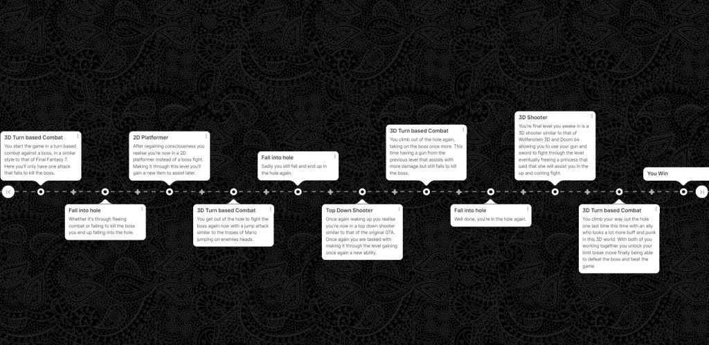 The game that I am creating will be a mix between 2D and 3D which will follow the main protagonist as he continues to fail defeating a boss over and over again, eventually falling down a hole and waking up in a different genre. Within these different genres he will need fight his way through to the end of them where he will unlock a new ability that he can use on the boss once he returns. Eventually after collecting enough he will be able to defeat the boss and finally win the game.
