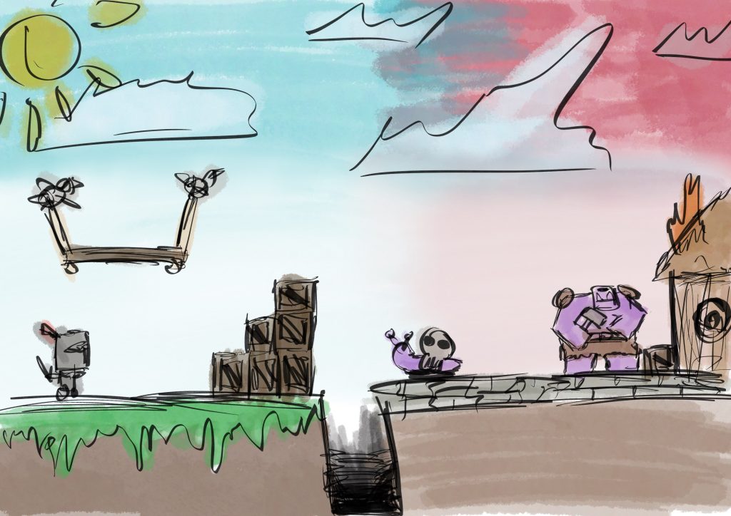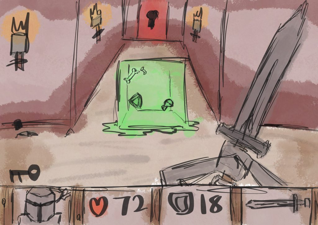 The game itself will consist of 4 different genres. The first genre will be a 3D turn based combat, this will be the main part of the game that you’ll return too after every level. This genre will also be were the protagonist continues his fight with the “boss”. The rest of the genres will consist of the side levels that you’ll either get pushed into or accidently fall into, and here you’ll receive your abilities. The first genre of these levels will consist of a 2D platformer, within this you will progress by platforming and fighting an array of monsters, after which you’ll receive the ability to bounce on the bosses head. The second genre of these levels will be a 2D top down shooter, within this you’ll have to survive a period of waves until something or someone helps you escape. You would receive a gun attachment for your sword in this genre. Finally the last genre that you would face would be a 3D first person shooter similar to that of the early Wolfenstein game and Doom game. Within this you’d continue fighting your way though enemies eventually getting to a cell were you would free a princess.